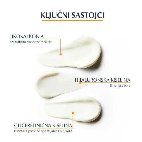 Formula je dodatno obogaćena kratkolančanom i dugolančanom hijaluronskom kiselinom i vidljivo smanjuje bore na licu i dekolteu.