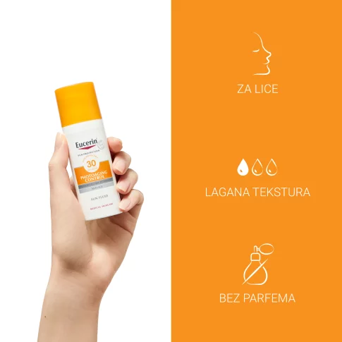 Eucerin fluid za zaštitu od sunca i sprečavanje fotostarenja SPF 30 je svakodnevna zaštita od sunca za sve tipove kože lica. Napredna spektralna tehnologija kombinira širokopojasne i fotostabilne UVA/UVB filtere za visoku UV zaštitu s likokalkonom A za neutralizaciju slobodnih radikala uzrokovanih UV i HEVIS svjetlošću. Anti-age krema za sunčanje također uključuje gliceretiničnu kiselinu koja podržava vlastiti mehanizam obnavljanja DNA kože.