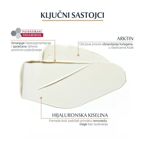 Vidno smanjuje pojavu i vidljivost staračkih pjega. Pruža dobru hidrataciju kože tijekom 24 sata te poboljšava čvrstoću i elastičnost kože.