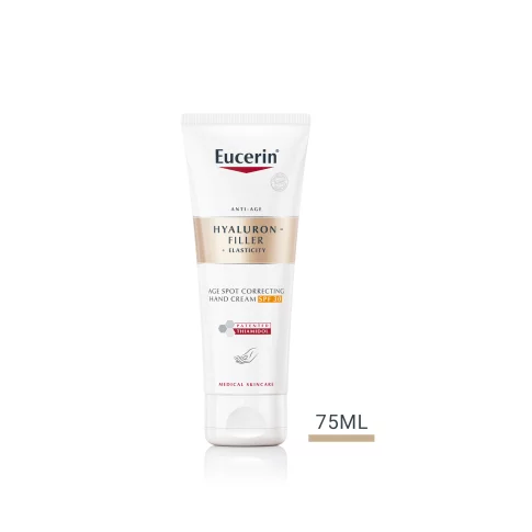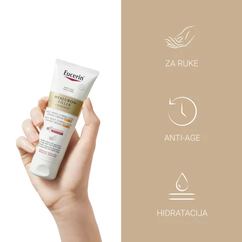 Eucerin Hyaluron Filler+Elasticity krema za ruke protiv hiperpigmentacija SPF30 brzo je upijajuća krema za korigiranje mrlja na koži ruku koja sadrži patentirani Thiamidol za smanjenje vidljivosti staračkih pjega te sprječavanje njihovog ponovnog pojavljivanja redovnom uporabom.