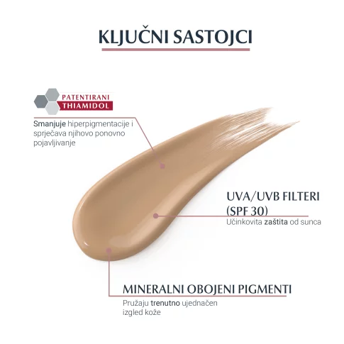 Eucerin Anti-Pigment dnevna tonirana njega SPF 30 (tamna nijansa) sadrži thiamidol, djelotvoran i patentiran sastojak koji djeluje na pojavu hiperpigmentacije smanjenjem proizvodnje melanina. Klinički i dermatološki dokazano smanjuje tamne mrlje i sprječava njihovo ponovno pojavljivanje. Prvi rezultati vidljivi su nakon dva tjedna i kontinuirano se poboljšavaju uslijed redovite primjene.