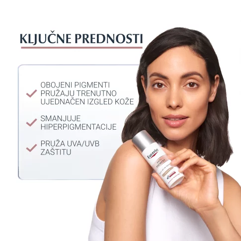 Eucerin Anti-pigment tonirana krema protiv hiperpigmentacija pruža trenutno ujednačen izgled kože, učinkovito smanjuje tamne mrlje i sprječava njihovo ponovno pojavljivanje.