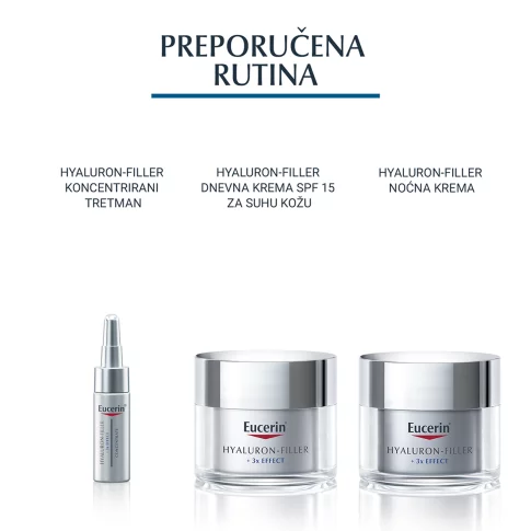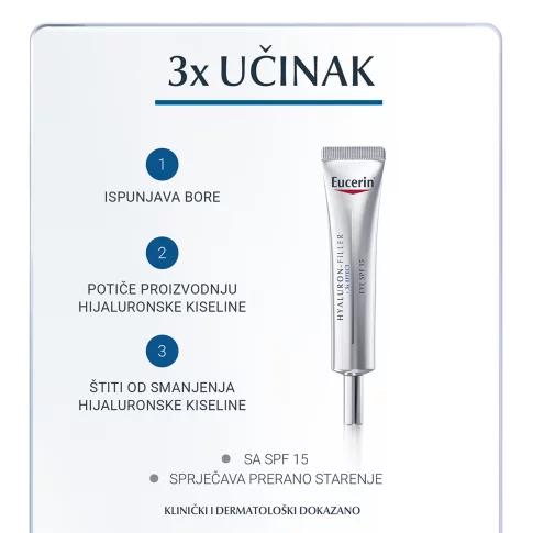Eucerin Hyaluron-Filler 3x krema za područje oko očiju anti-age je njega za područje oko očiju s hijaluronskom kiselinom, saponinom i enoksolonom koja suzbija proces starenja za vidljivo glatku, blistaviju kožu i kožu mladenačkog izgleda.