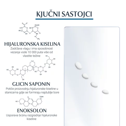 Eucerinova jedinstvena mješavina visoko i niskomolekularne hijaluronske kiseline, glicin-saponina i enoksolona pruža vidljivo popunjavanje čak i dubokih bora. Visokomolekularna hijaluronska kiselina poboljšava hidraciju i zaglađuje najudaljenije slojeve kože, dok niskomolekularna hijaluronska kiselina, koja je 40 puta manja, prodire dalje u slojeve kože epiderme gdje nastaju dublje bore. Antioksidans glicin--saponin podržava proizvodnju hijaluronske kiseline u sloju kože gdje nastaju najdublje bore i štiti od slobodnih radikala. Enoksolon štiti vlastiti hijaluron kože od propadanja.
