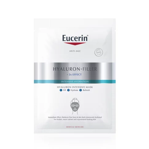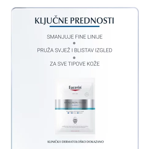 Eucerin Hyaluron-Filler anti-age maska za intenzivnu hidrataciju klinički i dermatološki dokazano pruža izvrsne rezultate, hladi kožu, smanjuje fine linije i ostavlja kožu sjajnom, svježom, blistavom i pomlađenom.