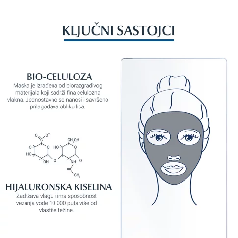 Eucerin Hyaluron-Filler maska za intenzivnu hidrataciju obogaćena je kombinacijom visoko i niskomolekularne hijaluronske kiseline. Kratkolančana hijaluronska kiselina poboljšava hidrataciju i zaglađuje fine linije u gornjim slojevima kože, dok niskomolekularna hijaluronska kiselina, koja je 40 puta manja, prodire dublje u epidermalne slojeve u kojima nastaju dublje bore.