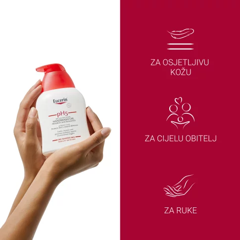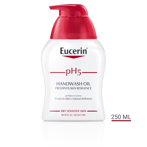 pH5 uljno sredstvo za pranje ruku posebno je formulirano s ekstra blagim površinski aktivnim sredstvima koja čiste suhe, osjetljive ruke bez isušivanja, čak i kod čestog pranja ruku. Jedinstveni Eucerin pH balansni sustav sadrži pH5 citratni pufer za obnavljanje i podršku optimalnog pH kože. Također, u sastavu ima i dekspantenol, aktivni sastojak poznat po svojim regenerativnim svojstvima.