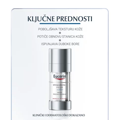 Dermatolozi koriste injekcije i pilinge s hijaluronskom kiselinom za pomlađivanje kože koja stari. Eucerin Hyaluron-Filler noćni piling i serum inspiriran je takvom vrstom tretmana i kombinira dvije učinkovite formule za višestruke anti-age učinke: