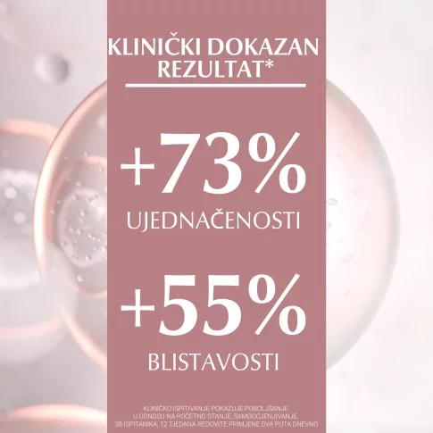 Klinički i dermatološki dokazano serum smanjuje tamne mrlje i sprječava njihovo ponovno pojavljivanje uz pružanje blistavog izgleda kože. Prvi rezultati su vidljivi nakon dva tjedna i kontinuirano se poboljšavaju uslijed redovite primjene. Koža je zaglađena, ujednačena i blistava.