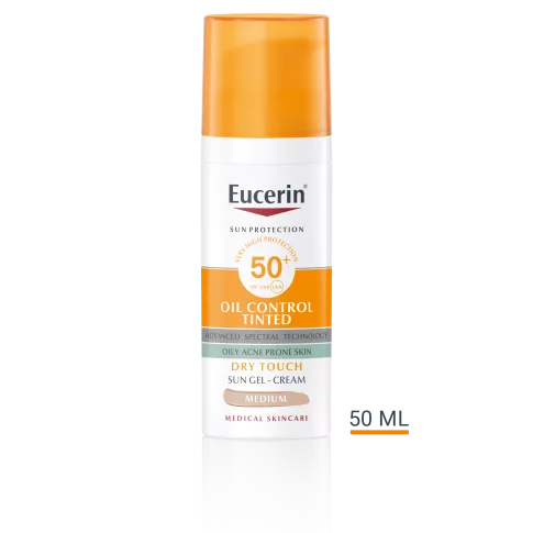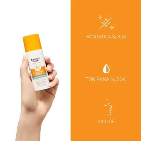 Eucerin Sun Oil Control tonirana gel krema SPF 50+ je svakodnevna krema s visokom zaštitom od sunca za masnu i aknama sklonu kožu. Tamna nijansa.