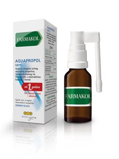 Farmakol Aquapropol sprej za grlo je vodena otopina suhog ekstrakta propolisa te ekstrakta kadulje i mente.