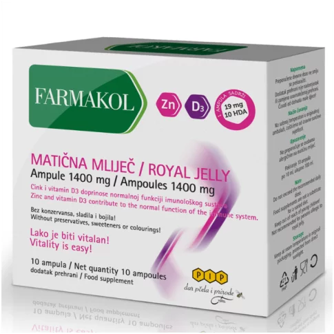 Farmakol 1400 ampule sadrže svježu matičnu mliječ u dozi od 1400mg i mikroelemente bakar i selen koji doprinose normalnoj funkciji imunološkog sustava.