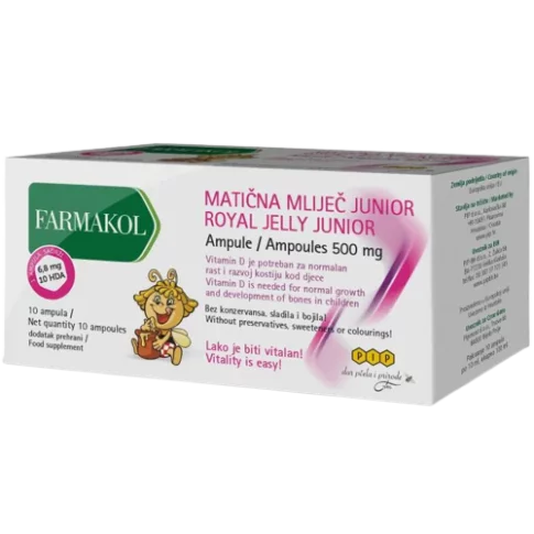 Farmakol Junior matična mliječ sadrži matičnu mliječ prilagođenu dječjoj dobi u dozi od 500mg, u kombinaciji sa vitaminom D, vitaminom B kompleksa i vitaminom C iz prirodnog izvora koji doprinose jačanju imunološkog sustava, jačim kostima i zubima te pravilnom rastu i razvoju djeteta.