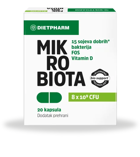 Dietpharm Mikrobiota kapsule s probioticima dodatak su prehrani s 15 sojeva dobrih bakterija, fruktooligosaharidima (FOS) i vitaminom D.