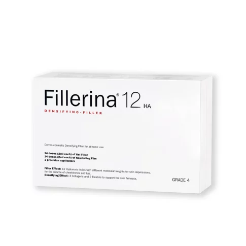 Fillerina STUPANJ 4 linija namijenjena je koži s izraženijim znakovima starenja. U četrdesetima, smanjuje se razina hijaluronske kiseline i proizvodnja kolagena. Prema istraživanjima, količina hijaluronske kiseline koju tijelo sadrži u dvadesetima do četrdesetih se otprilike prepolovi. Hijaluronska kiselina ključna je za usporavanje proces starenja kože jer njezine molekule na sebe vežu vodu koja popunjava prostor gdje bi inače nastale bore. Radi smanjene proizvode kolagena naša koža počinje gubiti elastičnost. Dolazi i do gubitka potpornog i potkožnog masnog tkiva što dovodi do veće opuštenosti lica.