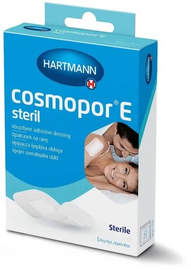 Cosmopor E Steril sterilni je flaster za zbrinjavanje rana izrađen od mekane samoljepljive podloge, netkanog materijala i hipoalergenog poliakrilatnog ljepljivog nanosa, s upijajućim jastučićem od čistog pamuka i mikroperforiranog polietilenskog filma koji se ne lijepi na ranu.