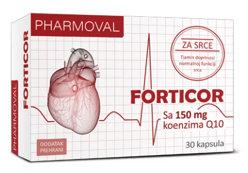 Forticor kapsule za srce sadrže visoku dozu od čak 150 mg koenzima Q10 u samo jednoj kapsuli. Sastav je obogaćen i s 200 % preporučenog dnevnog unosa vitamina B1, koji doprinosi normalnoj funkciji srca, te s 100 % vitamina B6 koji doprinosi normalnom metabolizmu homocisteina, čija je povišena razina u krvi čimbenik rizika za kardiovaskularne bolesti. Kapsule sadrže i magnezij, mineral važan za normalnu funkciju srčanog mišića.