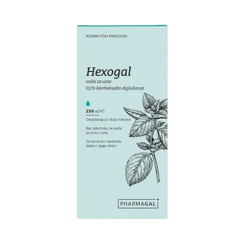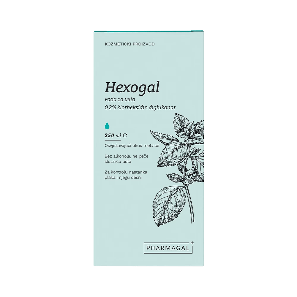Pharmagal Hexogal otopina sadrži antiseptik klorheksidin diglukonat koji se koristi za kontrolu razvitka plaka i održavanje oralne higijene.