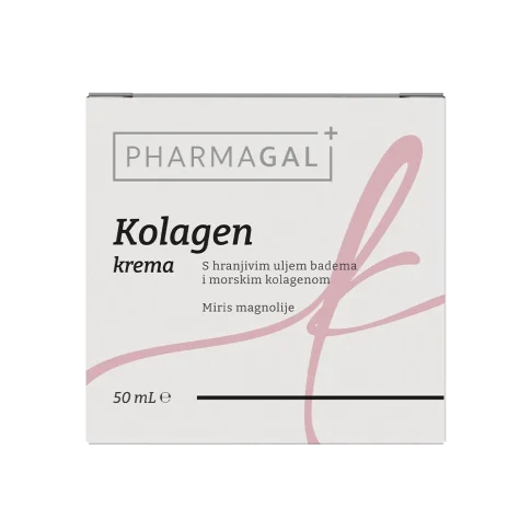 Pharmagal Kolagen krema sadržava visoku koncentraciju prirodnog, aktivnog kolagena, morskog podrijetla. Preporučuje se za intenzivnu njegu suhe i fotooštećene kože. Učvršćuje i povećava elastičnost kože.