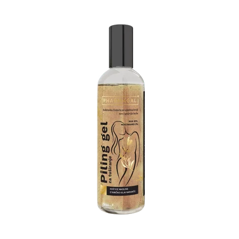 Pharmagal Piling gel za tuširanje kombinacija je kemijskog i mehaničkog pilinga za kožu. Sadrži 10% AHA, 2% niacinamida, koštice masline i eterično ulje naranče. Dubinski čisti za ujednačen ten i sjajniju kožu.