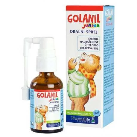 Golanil Junior oralni sprej je medicinski proizvod zaštitnog i umirujućeg djelovanja kod nadražaja grla uzrokovanog prehladom, alergijom ili kontaktom s vanjskim iritansima (poput dima, smoga, prašine). Ublažava popratne simptome, kao što su suhoća, peckanje, bol i otežano gutanje.