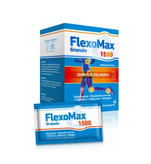 Hamapharm FlexoMax 1500 granule za zdravlje zglobova, hrskavice i kostiju pomaže obnavljanju hrskavice, podmazuje zglobove, povećava pokretljivost, ublažava upalu i bolove.