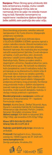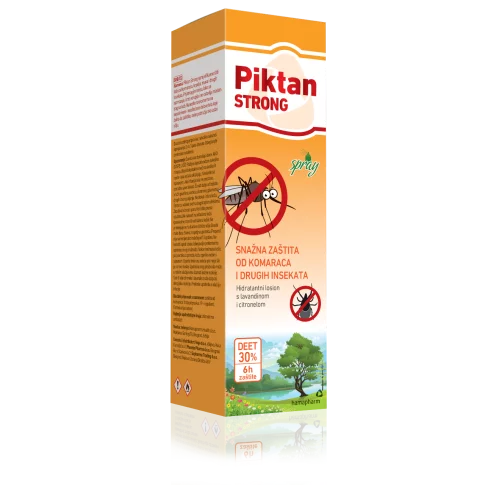 Hamapharm Piktan Strong sprej učinkovito štiti kožu od komaraca, krpelja, muha i ostalih kukaca. Ugodnog je mirisa, lako se razmazuje, brzo se upija i ne ostavlja masan trag na koži. Nanesite ravnomjerno na nepokrivene i neoštećene dijelove tijela koje želite zaštititi, osim područja oko usta i očiju. Sadrži 30% DEET, lavandin i citronelu te osigurava minimalno 6 sati zaštite.