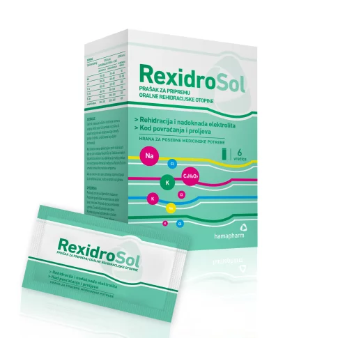 RexidroSol je prašak za pripremu oralne rehidracijske otopine s okusom jagode i namijenjen je za dijetalnu prehranu bolesnika s gubitkom elektrolita i vode, kod povraćanja i proljeva. Primjenjuje se kod rehidracije i nadoknade elektrolita, u prevenciji dehidracije i održavanju hidracije kod dojenčadi, djece i odraslih. Osmolalnost otopine: 230 mOsm/kg H2O.