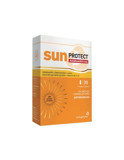 Hamapharm Sun Protect kapsule za zaštitu kože od zaštitu kože od posljedica sunčevog zračenja sadrže antioksidanse astaksantin, beta karoten, selen, ekstrakt sjemenki grožđa uz vitamine B, C i E.