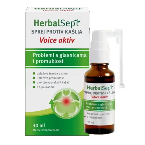 Jedinstvena biljna kombinacija umiruje nadražajni kašalj te smiruje upaljeno grlo. HerbalSept Voice Aktiv sprej sadrži islandski lišaj, hibiskus hijaluronsku kiselinu, med, aromu metvice, eukaliptusa i anisa koji će obložiti nadraženo grlo, umanjujući time podražaj na kašalj, te potaknuti brže zaliječenje upale.
