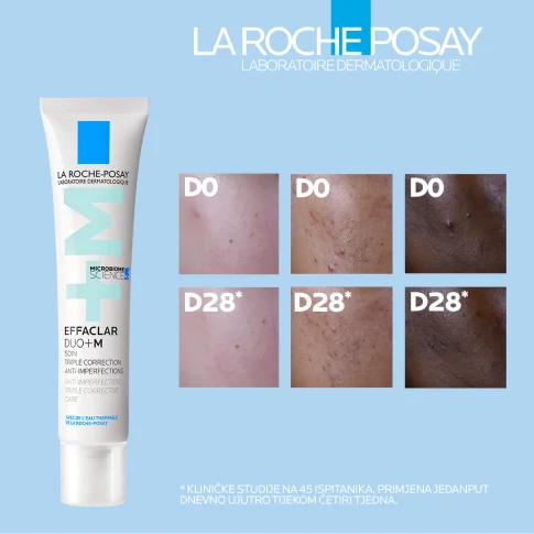 EFFACLAR DUO+M trostruka je korektivna njega protiv nepravilnosti za masnu i kožu sklonu aknama utemeljena na znanosti o mikrobiomu. Dokazano daje vidljive rezultate nakon 8 sati i učinkovit je na prištiće, mitesere i tragove od akni.