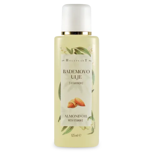 Holyplant bademovo ulje visoko je vrijedno ulje s prirodno sadržanim vitaminima i dodatno obogaćeno vitaminom E. Dobro prodire u kožu i pri tome održava njezinu prirodnu ravnotežu. Hrani i smiruje kožu, štiti je od isušivanja i gubitka elastičnosti, ne začepljuje pore i prikladno je za sve tipove kože.
