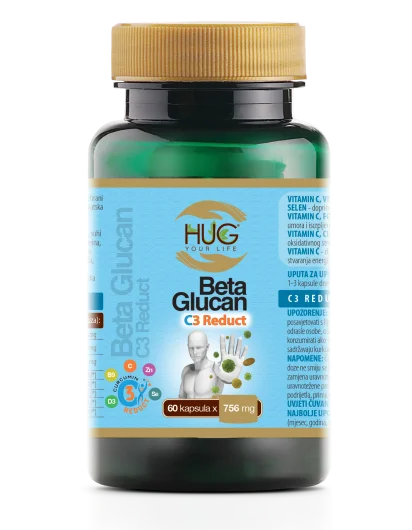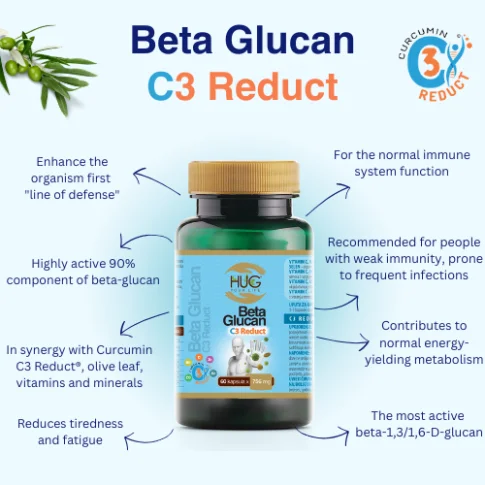 Beta Glucan & C3 Reduct – jedinstven proizvod na tržištu koji omogućava korištenje sinergijskog učinka biološki najaktivnijeg oblika beta-(1,3/1,6)-D-glukana, vitamina C, vitamina D, folne kiseline, selena, cinka te lista masline. Formula je dodatno ojačana C3 Reduct-om, inovativnim 99%-tnim ekstraktom kurkume koji sadrži 95% tetrahidrokurkuminoida, metabolita kurkuminoida koji imaju bolju bioraspoloživost i jače biološko djelovanje od drugih kurkuminoida.