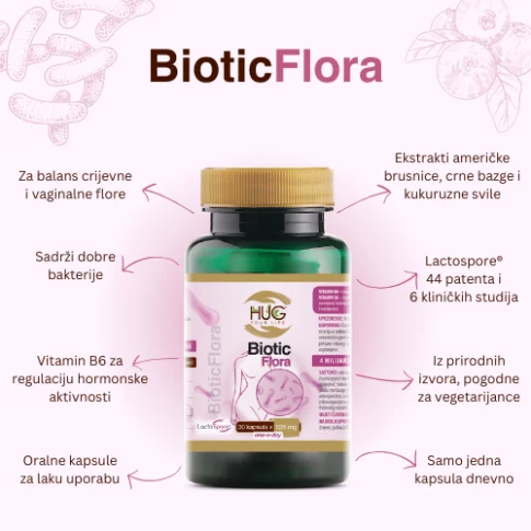 Hug Your Life BioticFlora kapsule s probioticima inovativan su dodatak prehrani namijenjen ženama. Sadrži dobre bakterije koje pojačavaju crijevnu mikrofloru – patentiranu kulturu mikroorganizama LactoSpore u kombinaciji s američkom brusnicom, crnom bazgom, kukuruznom svilom te prebiotik FOS uz dodatak vitamina B6 koji doprinosi regulaciji hormonske aktivnosti te smanjenju umora i iscrpljenosti.