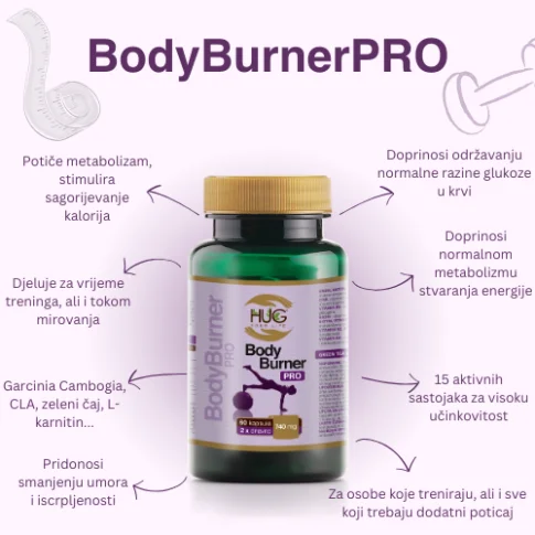 Hug Your Life BodyBurner PRO kapsule za mršavljenje sa samo 2 kapsule dnevno sadrži sve komponente koje trebamo za učinkovitu regulaciju odnosno poticanje metabolizma masti, ugljikohidrata, masnih kiselina i proteina u tijelu.