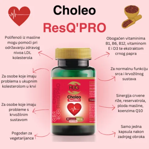 Hug Your Life Choleo ResQ’PRO kapsule za masnoću u krvi sadrže ekstrakt crvene riže, resveratrol, koenzim Q10 i suhi ekstrakt ploda masline te je dodatno obogaćen vitaminima E, D3, te vitaminima B1, B6, B12 koji doprinose normalnoj funkciji srca te normalnom metabolizmu homocisteina.