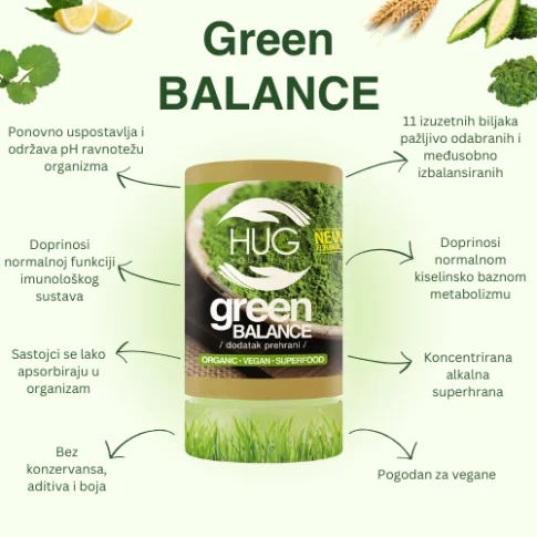 Hug Your Life Green Balance prah koncentrirana je alkalna superhrana, „zelena“ formula sačinjena od 11 izuzetnih biljaka pažljivo odabranih i međusobno izbalansiranih u sinergiji s cinkom koji doprinosi normalnom kiselinsko baznom metabolizmu i normalnoj funkciji imunološkog sustava.