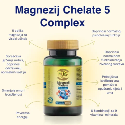 Hug Your Life Magnezij Chelate 5 Complex proizvod je koji se temelji na jedinstvenoj formuli 5 različitih oblika magnezija (bisglicinat, citrat, karbonat, malat, oksid) i 9 vitamina, minerala s visokom apsorpcijom i bioraspoloživosti.