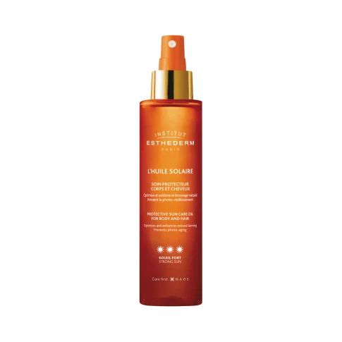 Institut Esthederm visokohranjivo zaštitno ulje za sunčanje štiti kožu i kosu od fotostarenja i suhoće. Optimizira prirodno tamnjenje te hrani i obogaćuje epidermu za dugotrajno mekanu, lijepu i zlatnu kožu.