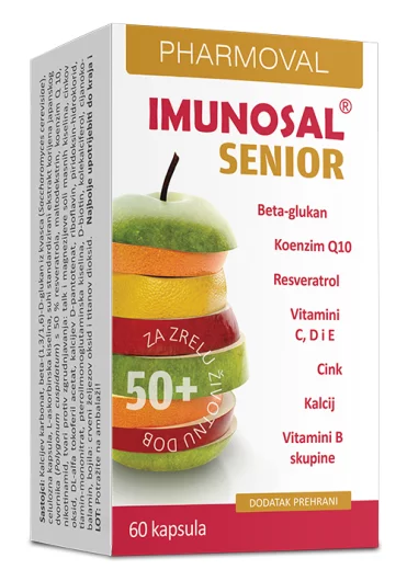 Imunosal Senior kapsule namijenjene su osobama zrele životne dobi. Uz visokopročišćeni beta-glukan, vitamine i minerale, dodatno su obogaćene s čak 30 mg koenzima Q10 i 100 mg resveratrola u dnevnoj dozi.