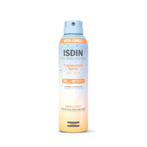 ISDIN Wet Skin SPF30 prozirni sprej za tijelo zaštita je od sunca s izuzetno laganom teksturom, koja se odmah suši i može se nanijeti i na mokru kožu. Sadrži Ginger Cell Protect koji pruža zaštitu stanicama od oksidativnih oštećenja.