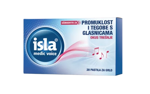 ISLA-medic VOICE pastile za promuklo grlo s trešnjom sadrže hijaluronsku kiselinu poznatu kao prirodno sredstvo koje se koristi za njegu glasnica, a njezino djelovanje dodatno je pospješeno dodatkom prirodnog ekstrakta islandskog lišaja i hidrogelnog kompleksa koji na sluznici stvara zaštitni film, te njeguje sluznicu i smiruje snažno napregnute glasnice.