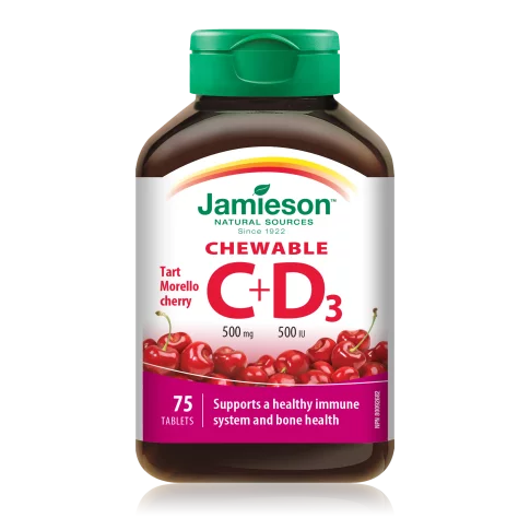 JAMIESON Vitamin C 500mg + D 500IU tablete za žvakanje s okusom trešnje dodatak su prehrani koji sadrži dva važna vitamina – vitamine C i D u obliku praktičnih tableta za žvakanje s prirodnim okusom trešnje.