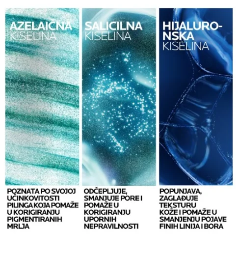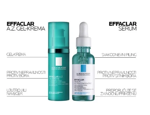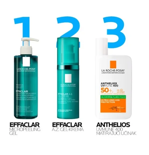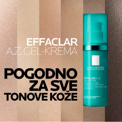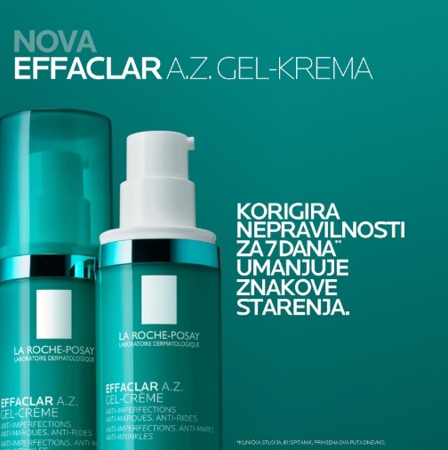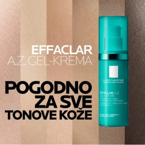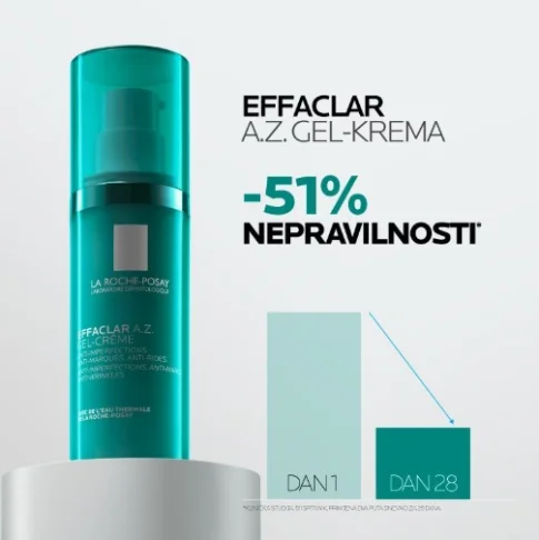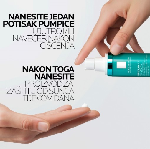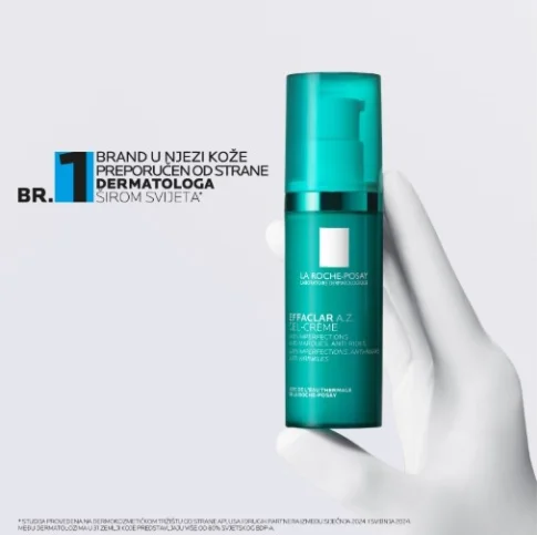 La Roche-Posay Effaclar A.Z. Gel krema jedinstvena je formula koju pokreću dermatološki preporučene tri kiseline: azelaična + salicilna + hijaluronska kiselina te cink za dvostruko djelovanje protiv nepravilnosti i starenja kože.