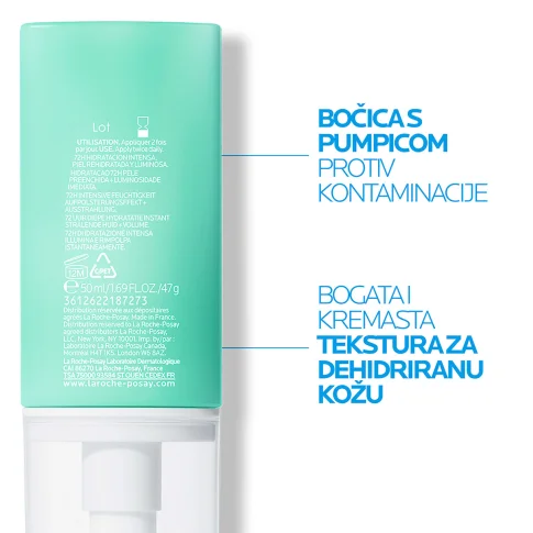 Pruža koži hidrataciju u trajanju od 72 sata i trenutnu popunjenost za osnaženu i blistavu kožu. Ova formula jedinstveni je spoj termalne vode La Roche-Posay poznate po prirodnim umirujućim svojstvima i čiste hijaluronske kiseline dobivene procesom biofermentacije putem Zelene tehnologije uz upotrebu biljnih šećera.