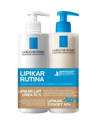 La Roche-Posay Lipikar promo pakiranje sadrži hidratatno mlijeko obogaćeno ureom uz sindet za pranje suhe kože po promotivnoj cijeni.
