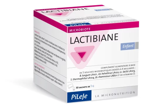 Pileje Lactibiane Enfant vrećice su dodatak prehrani za jačanje imunološkog sustava djece. Sadrže 5 sojeva probiotičkih kultura: 4 soja iz Lactibiane Référence-a + Lactobacillus rhamnosus te vitamin D43 koji doprinosi normalnom rast i razvoju. Lactibiane enfant se preporučuje za smanjivanje čestih probavnih tegoba, jačanje imuniteta te smanjivanje rizika od infekcije rotavirusom.