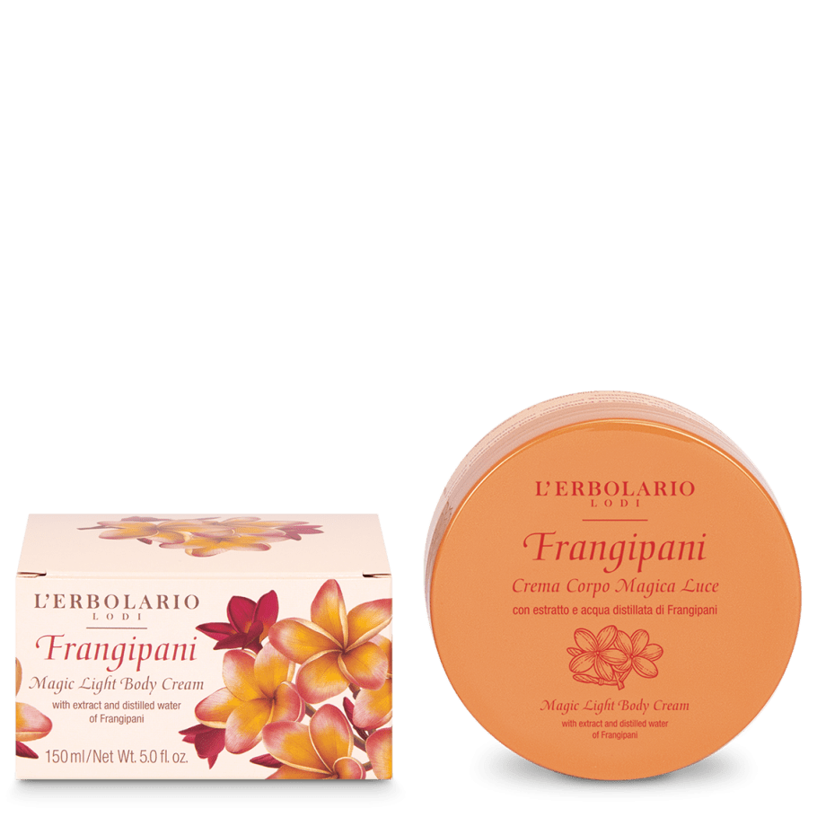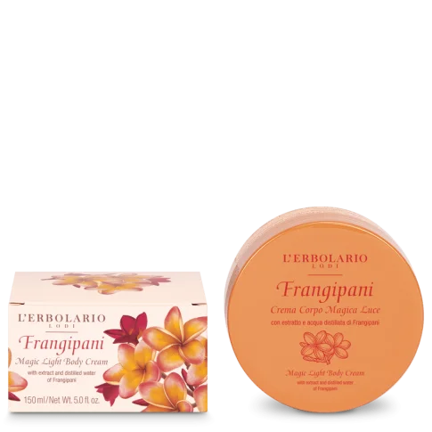 L’Erbolario Frangipani svjetlucava krema za tijelo mirisna je njega za tijelo s nježnom svjetlucavom teksturom.