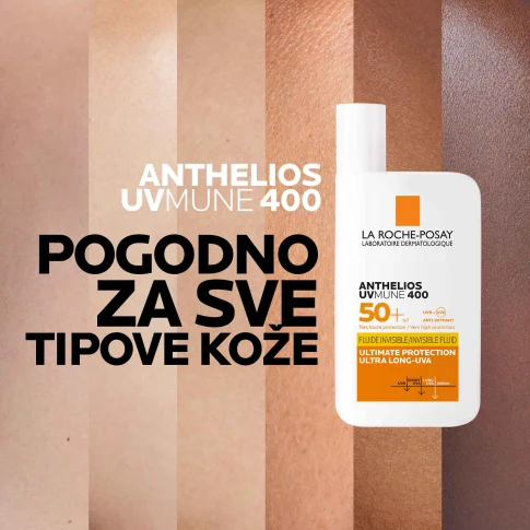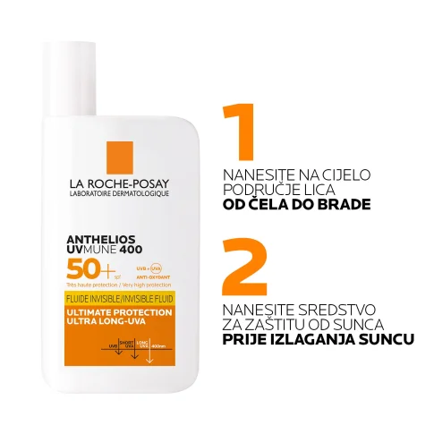La Roche Posay Anthelios UVMUNE 400 fluid s filterom MEXORYL400, najučinkovitijim UV filterom laboratorija La Roche Posay, štiti od najpodmuklijih UV zraka. Ultimativna zaštita (UVB + UVA + ULTRADUGE UVA ZRAKE) protiv dubinskog oštećenja epidermisa.