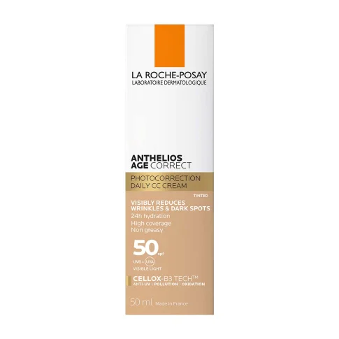 Anthelios Age-Correct SPF50 Tinted cjelovito je rješenje za borbu protiv UV zraka, zagađenja, bora i tamnih mrlja. Sprječava i ublažava znakove starenja nakon 4 tjedna upotrebe. Pruža zaštitu od širokog spektra i dermatološke korektivne aktivne sastojke, poput hijaluronske kiseline, niacinamida i feniletil rezorcinola.